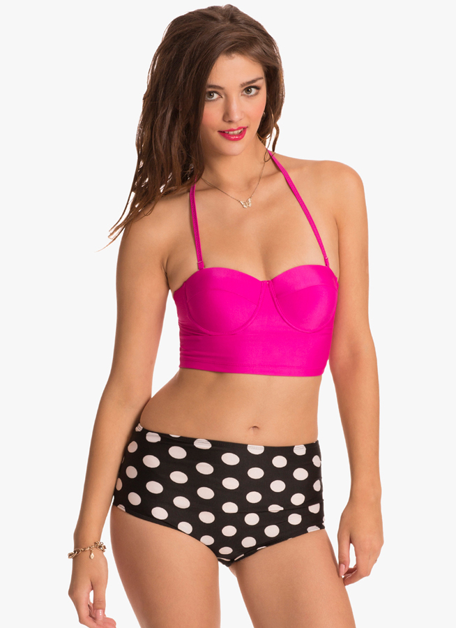 Look sexy with this retro styled beachwear from Pretty Secrets. Crafted from ployamide spandex for a perfect fit, this beachwear features magenta coloured, push-up halter long-line bikini top with polka dots and black coloured high-waist bikini bottom.